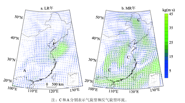 Fig. 6 Mean differences of integrated water vapor flux between the two simulations (EXP2000 minus EXP1980) for the LR years and MR years图6 LR年和MR年平均的EXP2000与EXP1980整层水汽通量之差(EXP2000-EXP1980) |