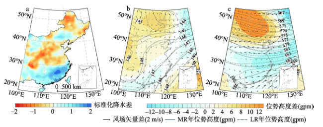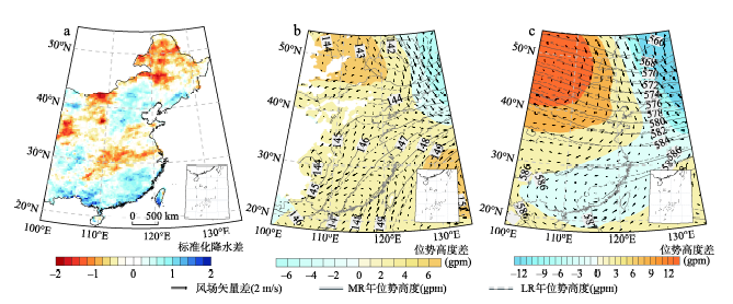 Fig. 8 Differences of standardized summer precipitation from ground measurements (a), geopotential height and wind field between MR years and LR years (MR years minus LR years), at the pressure level of 500 hPa (b) and 850 hPa (c), derived from the NCEP2 reanalysis data图8 地面观测的MR年与LR年标准化夏季降水之差(a. MR-LR年)及NCEP2再分析资料中MR年与LR年850 hPa(b)和500 hPa(c)的位势高度之差和矢量风之差 |