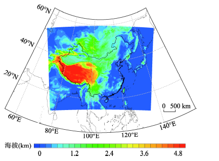 Fig. 1 Domain and topography of WRF simulation图1 模拟试验的区域范围及地面海拔 |