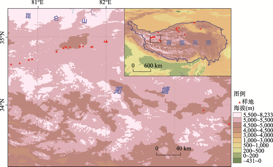 Fig. 2 Study sites of Ceratoides compacta alpine desert on the Tibetan Plateau and in the depopulated zone of northwestern Qangtang Plateau图2 垫状驼绒藜高寒荒漠研究样地在青藏高原及羌塘西北无人区的分布 |