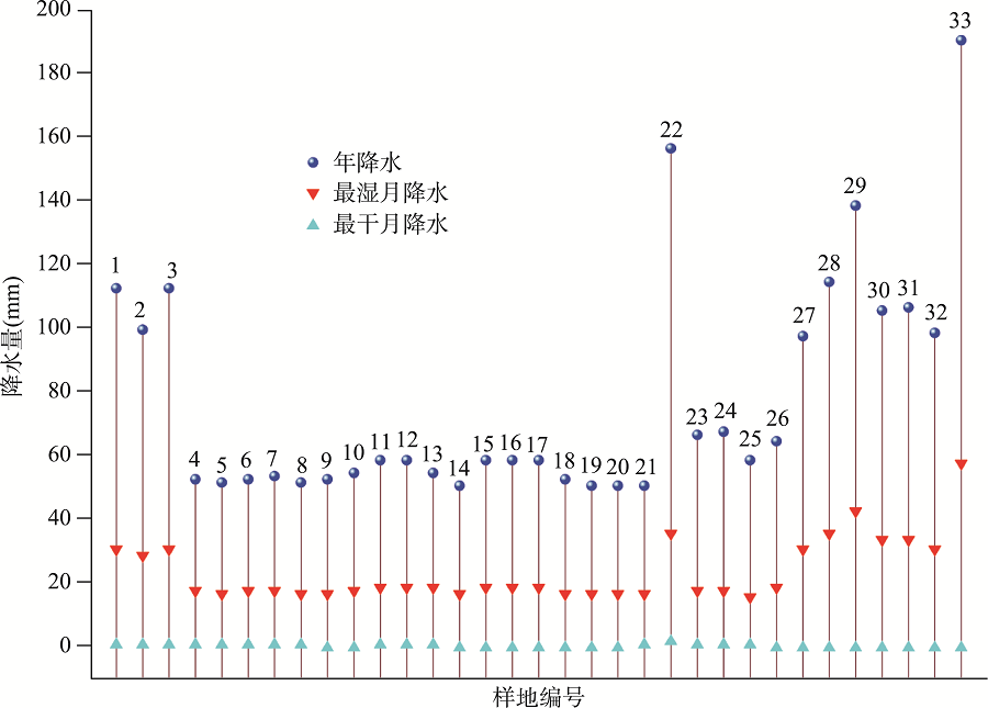 Fig. 4 Precipitations in the 33 study sites of Ceratoides compacta alpine desert图4 33个垫状驼绒藜高寒荒漠样地的降水特征 1~21:羌塘西北无人区样地;22~25:西祁连山样地;26~32:昆仑山—阿尔金山样地;33:可可西里样地 |