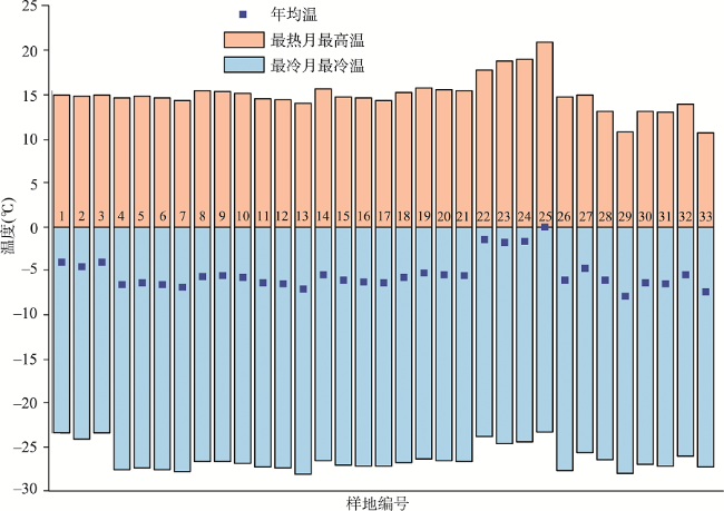 Fig. 3 Temperatures in the 33 study sites of Ceratoides compacta alpine desert图3 33个垫状驼绒藜高寒荒漠样地的温度特征 1~21:羌塘西北无人区样地;22~25:西祁连山样地;26~32:昆仑山—阿尔金山样地;33:可可西里样地 |