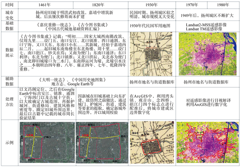 Fig. 2 Spatial reconstruction of urban land use of an ancient city (e.g. Yangzhou City)图2 典型城镇(扬州)历史形态复原过程示意 |