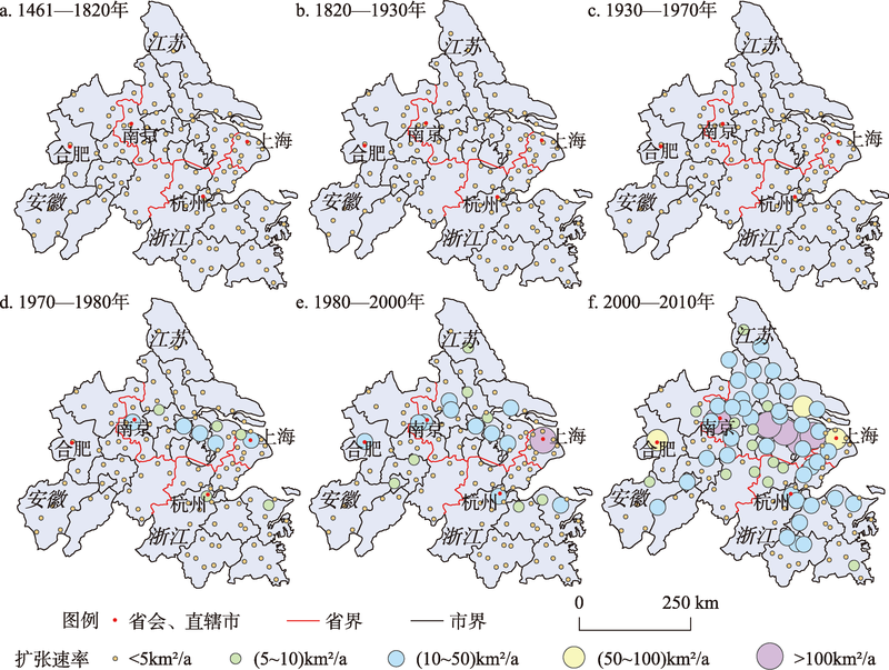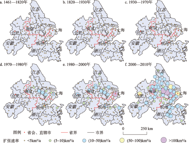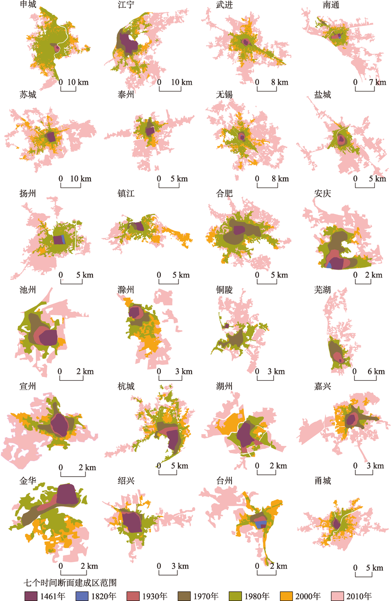 Fig. 3 The expansion of urban construction land of prefecture-level cities of Yangtze River Delta in the past 600 years图3 近六百年来长江三角洲地区地级以上城镇建成区范围变化过程 |