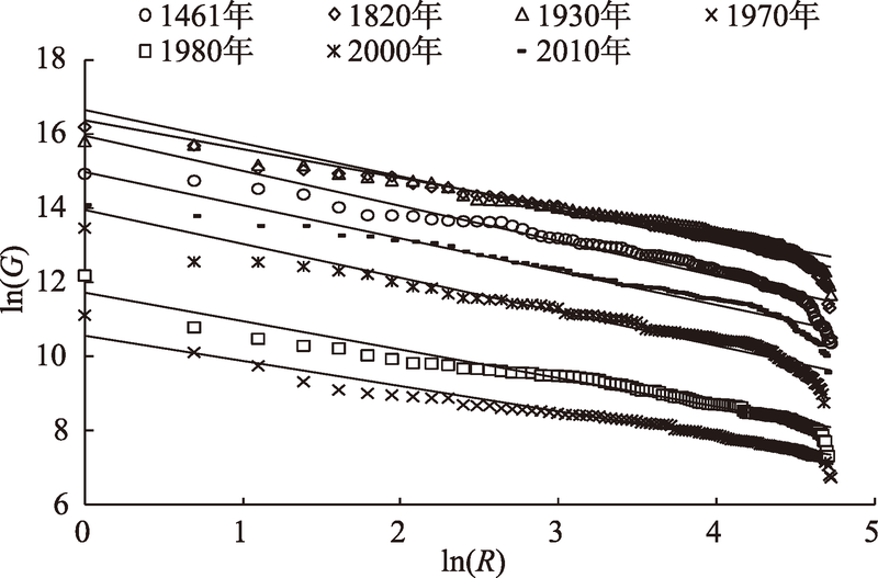 Fig. 6 Estimates for city rank-size rule in Yangtze River Delta图6 长江三角洲地区城镇位序-规模线性拟合 |