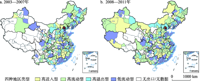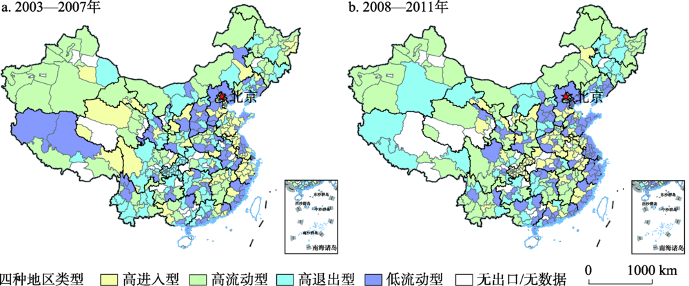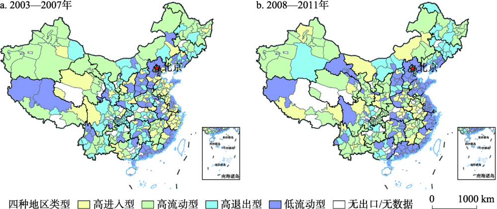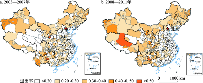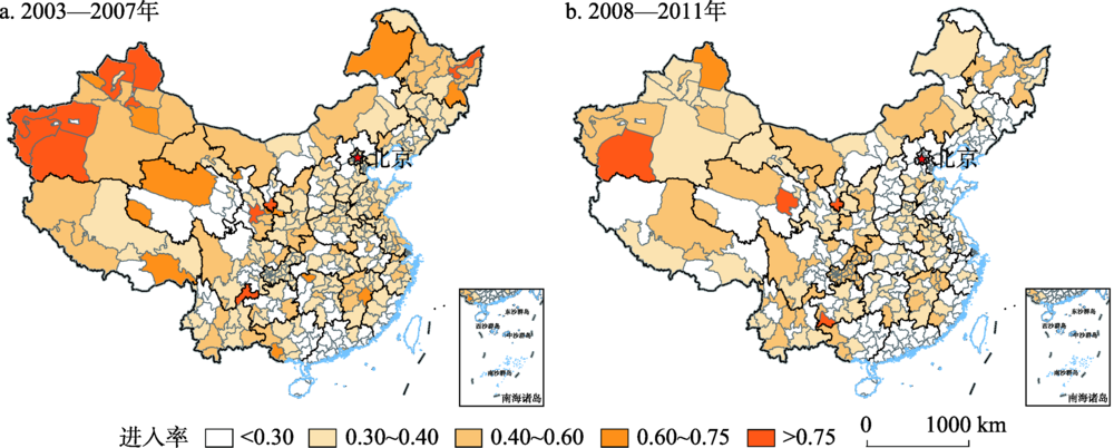 图8 中国地级市加工贸易企业出口动态注:该图基于国家测绘地理信息局标准地图(审图号为GS(2016)1599)绘制,底图无修改。 Fig. 8 Export dynamics of Chinese firms in processing trade at prefecture level |