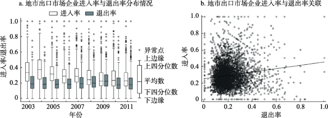 With the growth of the total export of Chinese firms, the export dynamics of firms in various regions show obvious spatial imbalance. The study of export dynamics helps to better understand the patterns that support the growth of trade and the changes in the structure of the trade type. This study tries to examine the pattern of export dynamics of Chinese firms over the past decade and identify the influencing factors of export dynamics based on using prefecture level cities from the perspective of export varieties. During 2003-2011, the export dynamics changed from high-speed growth to substantial decline and then to steady growth. In terms of Chinese firms’ entry and exit dynamics, the export entry rate and export exit rate in most regions have been significantly reduced in time dimension, and the export dynamic of firms tended to be stable; in spatial dimension, the eastern region had a lower level of export entry rate and export exit rate than the central and western regions. At the same time, it showed the characteristics of regional agglomeration, and the trade-growing areas showed the trend of moving from the coastal to the inland areas. This trend was more obvious in general trade compared with processing trade. Empirical research shows that Chinese firms' exporting dynamics are affected by export product variety and export market variety. Export product variety improves the entry rate of local firms through information discovery effect, but does not help firms keep in the foreign markets, which means that the export learning effect does not work at least in the short to medium term. However, export market variety can restrain firms from withdrawing from the markets, though it has no benefit to improve the entry rate. As for the robustness check, this paper divided the observations into two parts according to trade types, and finds that the risk diversification effect is more obvious in general trade. For the firms that are able to export repeatedly or continuously, the diversity of export products can reduce the exit rate, indicating that the export learning effect may be related to the duration of firms' participation in exports.