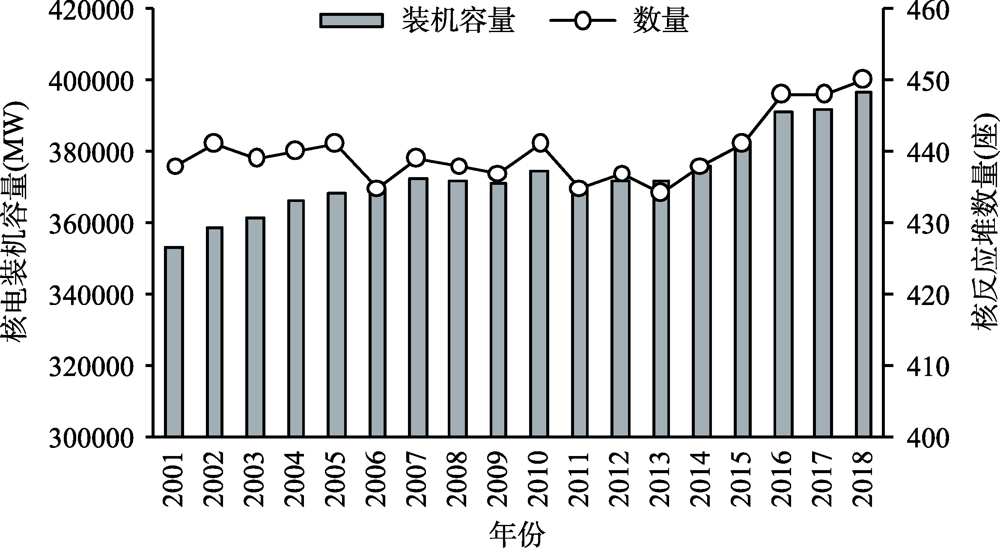 图3 2001—2018年全球在运核反应堆数量及发电装机总容量注:数据来源于国际原子能机构(https://www.iaea.org);世界核协会(https://www.world-nuclear.org)。 Fig. 3 Annual number and electricity capacity of nuclear reactors in operation worldwide from 2001 to 2018 |