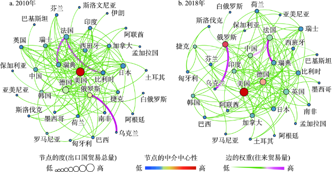 图8 世界核电国家核反应堆燃料及原料产品出口贸易网络变化(2018年对比2010年)Fig. 8 Comparison of export trade networks of main countries in nuclear fuel and elements (2010 vs 2018) |