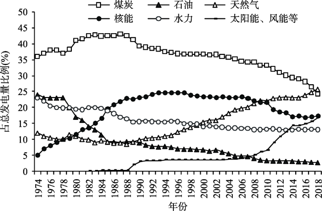 图2 OECD国家电力生产结构变化(1974—2018)注:数据来源于国际能源署(https://www.iea.org)。 Fig. 2 Change in fuel types for electricity generation in OECD countries (1974-2018) |