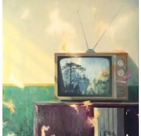 | 名称:凝固的时间 内容:在夕阳的映照下,一台老式电视机在播着黄山松的画面 符号:黄山松、老式电视机 作者:黄伟鸿 形式:布面油画 |