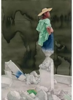 | 名称:XS29 内容:一个农民工叉腰站在废墟之上,眺望远方 符号:农民工、废墟 作者:刘声 形式:纸面水彩 |