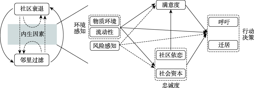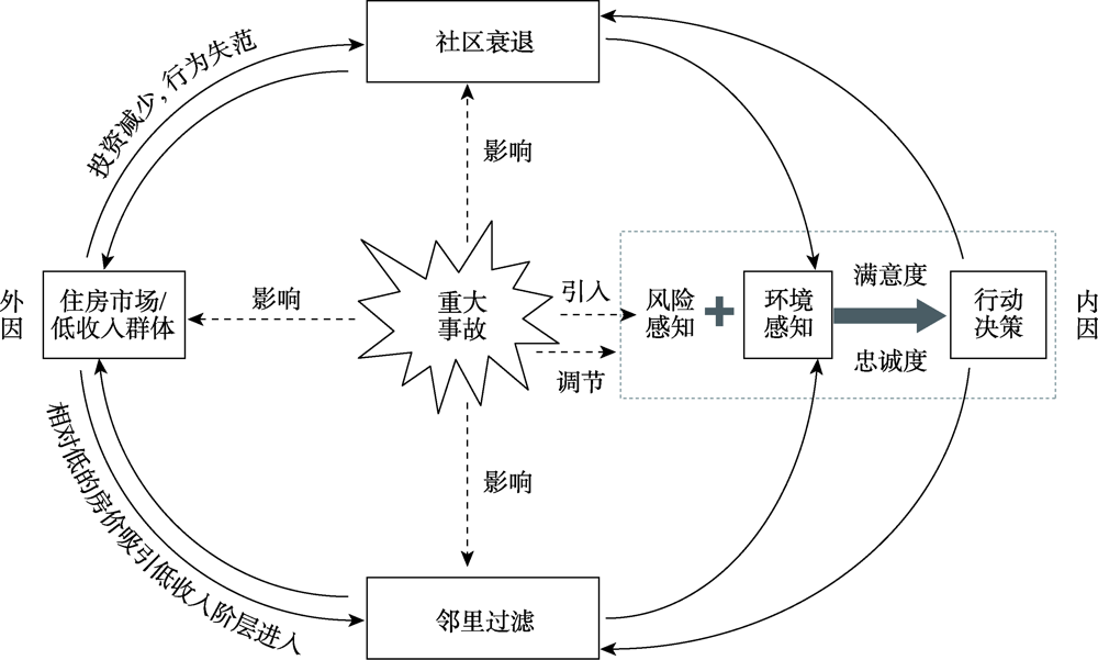 Worker communities, as the living area of the work unit (danwei), had been suffering the physical and societal decline since state-owned enterprise reform and industrial structure adjustment in China. The resident replacement that high income groups moved out while lower groups moved in had taken place, which was called filtering. Worker communities should enhance their resilience to struggle over shocks and avoid declining. The filtering theory of community decline indicated that decline and filtering positively strengthen each other, which led to a downward spiral. However, the theory only focused on the gradual decline of the community but ignored the influence of accidents. For worker community which was adjacent to chemical factory, the shocks included not only gradual events such as creaking infrastructure, but also emergencies such as industrial accidents. Given this, the study established a conceptual model of community decline, which integrated the influence of accidents into the filtering theory. Taking N community as a case, which had been disconnected from the unit and encountered several chemical explosion accidents, this paper applied questionnaire surveys, interviews, text analysis and structural equation model to discuss the interaction mechanism of decline and filtering. The results showed that the decline of the community was the result of a combination of factors within and outside the community: (1) For the internal mechanisms, decline and filtering were both the cause of environmental perception which includes the perception of physical environment and community mobility, and the result of action decision-making, including voice and exit. Positive environmental perception promoted satisfaction and loyalty, which in turn influenced action decisions. The stronger the risk perception, the lower the level of community attachment in loyalty, and the more the residents are likely to leave. Besides, rick experiences moderated the influence of risk perception on satisfaction and the influence of community attachment on satisfaction. (2) For the external mechanisms, decline and filtering were affected by low-income groups and the entire housing market, which were also influenced by the accident. Considering both gradual and sudden factors, this research established the filtering mechanism of community decline under the influence of accidents from a micro perspective of residents' decision making and it was a new exploration of community decline research. Finally, aiming at enhancing community resilience to resist multiple shocks, this study proposed suggestions for improving residents' community loyalty, and encouraging more community participation.