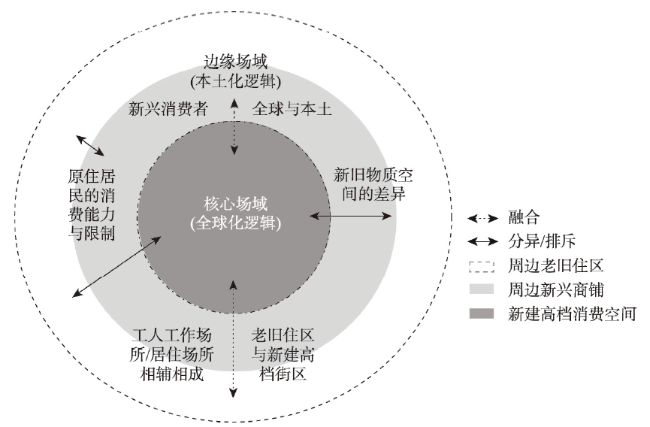 This paper uses the commercial gentrification space of Daci Temple Community in Chengdu as the case. Based on Pierre Bourdieu's ‘field’ theory, it analyses the interest demand and capital acquisitions from the different actors of local government, developers, gentrifiers, residents, surrounding merchants and tenants. Then, it explores the influence mechanism between commercial gentrification and surrounding old neighborhoods. Using two qualitative research methods of participant observation and semi-structured interview, the empirical research findings show that commercial gentrification and surrounding old residential areas constitute a gentrification field, where different actors acquire and accumulate their own capital to establish social practice status. The gentrification core field composed of high-end consumption space where the local government and private developers unite. Specifically, the former pursuits the symbolic capital brought by beautification image driven by the development of the global city and national central city, while the latter accumulates maximum economic capital. Gentrifiers promote the development and consolidation of commercial gentrification in the process of pursuing a lifestyle consistent with their own social attributes. However, the residents are in a weak position in the process of gentrification, which becomes the subject of capital outflow. In the marginal field, the surrounding merchants begin to reconstruct businesses to cater to gentrifiers. Besides, with the new consumption space in the core field, the surrounding tenants have acquired economic and social capital in the whole gentrification field. Therefore, this paper reveals two important capital logics in the field. The core field of gentrification is promoted by the interest alliance formed by the local government, developers and gentrifiers, which reflects a top-down global capital logic. The marginal field is constructed by residents, surrounding merchants and tenants, which is presenting a bottom-up local capital logic. This is because the marginal field is influenced by the core field, forming a dynamic mutual relationship with the core field. Finally, this research fills the theoretical gap for the impact of China's commercial gentrification on surrounding residential areas, and in light of the practice value for the renovation of commercial space in urban centers.