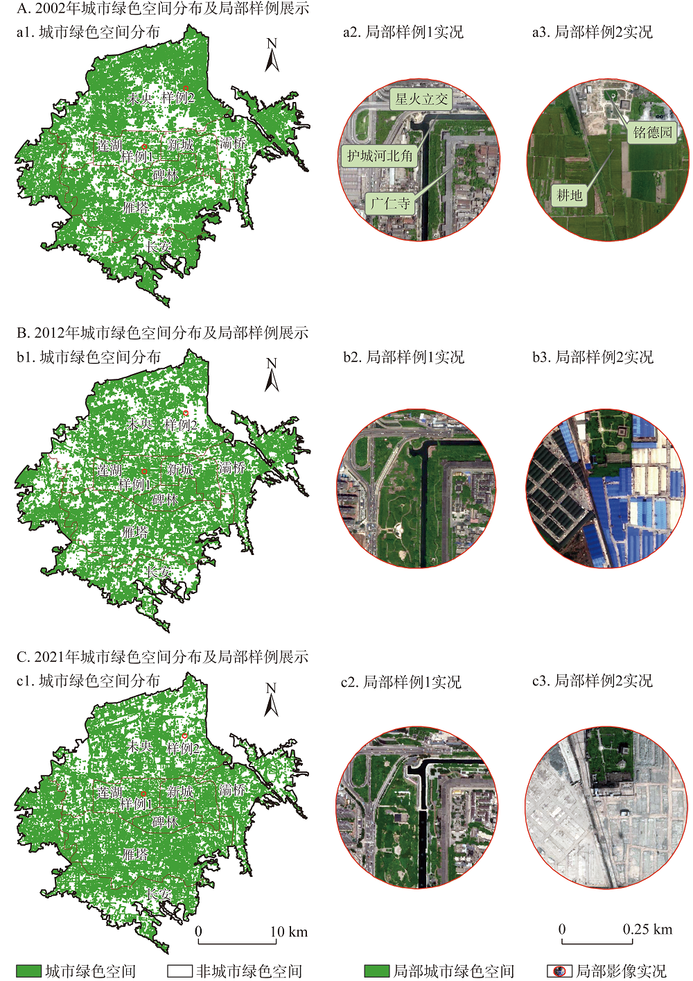 | Google-earth高 分辨率影像 | Google-earth官网 (https://earth.google.com.hk) | 5 m | 识别城市绿色空间 | 2002年、2012年、2021年 |