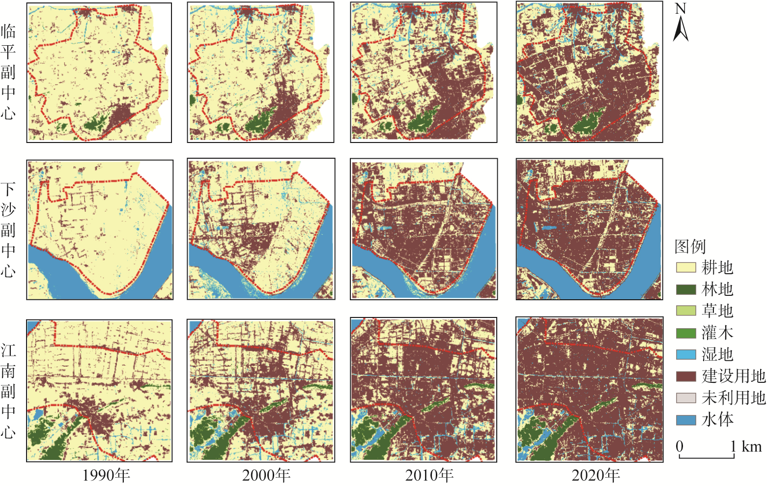 Land use change process of Hangzhou's sub-centers (1990-2020)