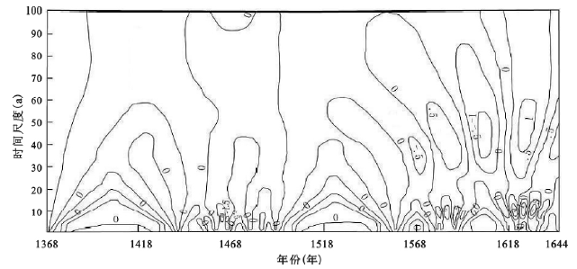 据前文所述,很难看出关中平原明代霜雪灾害发生的更短周期的变化信息,对此我们采用可对时间序列进行系统深入解析的小波分析方法,对各灾害等级数据进行处理分析。从图6中可以看出,存在多重时间周期尺度上的周期嵌套复杂结构现象,也可看出在不同阶段的同一周期振荡以及同一阶段的不同周期振荡所表现出来的强弱程度是不一样的,图中信号振荡的强弱通过数值的大小来表示,数值越大表示霜雪灾害发生频次越大于常年,霜雪灾害造成的损失越严重;数值越小表示霜雪灾害发生频次越小于常年,造成的损失越低。图中明显地存在8 a左右短期振荡周期、11 a左右的中期振荡周期和44 a左右的长期振荡周期。这表明,关中平原明代轻度霜雪灾害发生存在着11 a左右的中周期,中度霜雪灾害发生存在着8 a左右的短周期,重度霜雪发生存在着44 a左右的长周期。另外,从图中亦能看出1644年后44 a左右的长期振荡周期等值线未闭合,表明明末以后在该周期上的霜雪灾害仍有发生的趋势,说明该时期仍处于较寒冷时期,即“明清小冰期”。