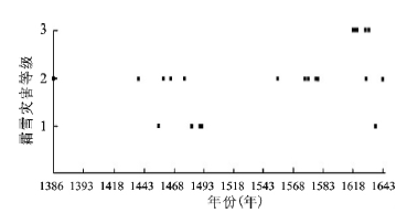 6.3 a发生1次,灾害频次最高,其中重度霜雪灾害发生5次,该阶段灾害发生频次和强度均是明代时期最频繁、最大的,尤其是17世纪20年代发生霜雪灾害4次,其中重度霜雪灾害发生3次。总体而言,从明代早期到晚期,霜雪灾害发生频次呈增高的趋势(图2)。