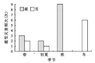 霜雪灾害使得土地表面和植物表面温度骤降而导致植物遭受伤害甚至死亡,这就使得霜雪灾害的发生具有季节性的特点。根据资料[14~16]对霜雪灾害的季节统计(图5)可知,关中平原明代霜雪灾害高发季节为秋季,以霜灾为主,发生频次为9次,主要由于气温骤降影响秋作物的正常成熟和果实的品质;其次为冬季,以雪灾为主,发生频次为6次,主要原因是冬季持续的降雪低温使农作物和牲畜受到危害甚至死亡;第三为春季,霜灾频次为3次,雪灾为2次,倒春寒或春雪过晚危害关中平原的棉花、春播作物的幼苗和苹果的正常授粉,易导致生长期延迟,不能充分成熟,引起减产甚至绝产;夏季灾害发生最少,频次为3次,此时正值植物生长旺季,剧烈的降温对作物的危害更为明显。关于明代霜灾共发生14次,其中早霜为9次,晚霜为5次,表明明代时期关中平原早霜危害严重,主要发生在8~9月。