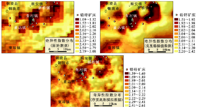 可见,由于采样间距较为稀疏,根据原始数据计算得到的奇异性指数分布图中出现大量规则的斑块状区域,斑块内奇异性指数大体相等,无法很好表征奇异性指数空间分布的精细结构。而基于克里格插值结果的奇异性指数对这种“斑块状”特征有较好改善,富集区域较为平滑,但由于克里格方法的平滑效应,其奇异性指数的数值范围(1.51~2.42)较原始数据(1.09~3.08)有大幅缩小,克里格方法不但对于原始高值数据有平滑效果,同时也降低了奇异性指数对比程度,这对于异常信息的识别和提取非常不利。基于序贯高斯模拟数据的奇异性指数的数值范围(1.39~2.61)较克里格方法有较大改善,提高了奇异性指数对比程度,并能够更精细刻画局部奇异性指数空间分布特征。同时,由于奇异性指数表征的是局部场的分布特征和空间自相似性,因此一定程度降低了序贯高斯模拟的破碎凌乱程度,对序贯高斯模拟结果也起到一定的改善作用。
