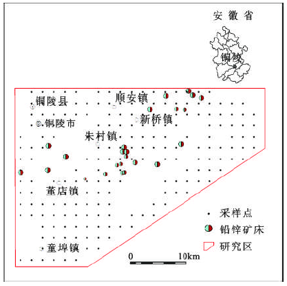 本文采用的勘查地球化学数据为安徽省铜陵矿集区土壤Pb元素含量数据。数据来源于安徽省地质调查院“安徽省江淮流域多目标区域地球化学调查”资料,土壤样品为较稳定地块的表层土壤,按间距为2 km稀疏网格采样(图 1),样本数共计204件。
