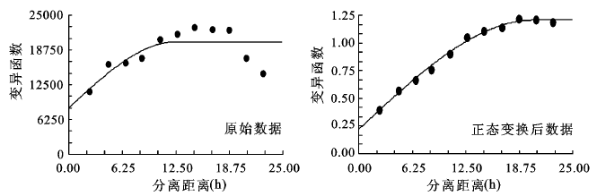 图2可见,应用原始数据直接计算得到的变异函数趋势混乱、跃动明显,半变异函数先逐渐增加到一稳定值后又表现出降低的趋势,呈现不平稳的特性。而通过正态变换的数据变异函数则具有良好的空间平稳结构,呈现明显的球状理论变异函数特征,因此本文采用球状理论变异函数模型对实验变异函数进行拟合(表2)。