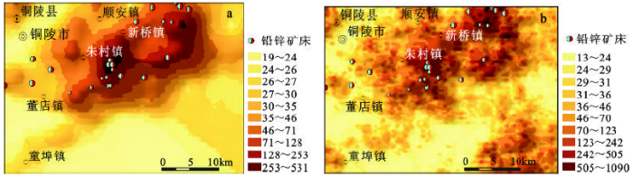 3) 克里格方法不但对原始数据有平滑效果,也压缩了基于其计算得到的奇异性指数的数据范围,而基于序贯高斯模拟数据的奇异性指数较之克里格方法有较大改善,扩大数值范围、提高对比程度。对稀疏采样数据集,较之原始数据和克里格方法,基于序贯高斯模拟数据获取的奇异性指数可以更精细的刻画局部空间结构,突出局部异常。铜陵矿集区实例显示,序贯高斯模拟数据得到的土壤Pb元素富集区域与已知铅锌矿床的分布更加吻合,具有更好的异常识别效果。