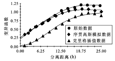 2) 序贯高斯模拟与原始数据的变异函数曲线具有较好的一致性,特别是在分离距离较小的范围内,两者空间变异特征基本一致,较之克里格方法,序贯高斯模拟结果在空间结构上与原始数据更为相似。