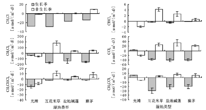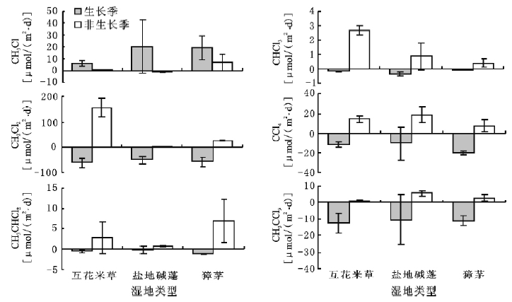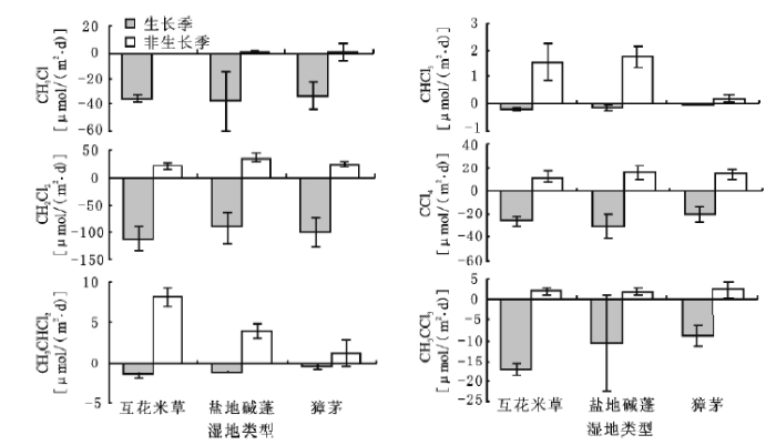 盐沼生态系统高等植物地上部分去除前后氯代烷烃不同单体成分通量季节和空间变化非常显著(p <0.001)[7 ~10 ] ,具有相对一致的季节和空间变化趋势,即生长季表现为氯代烷烃的汇,而非生长季为氯代烷烃的弱源,光滩更多的时候表现为吸收氯代烷烃(图1 ,图2 )。但是,高等植物地上部分生长季对氯代烷烃不同单体成分贡献的季节变化特征存在明显差异(图3 ),就整体变化趋势而言,大致可以分为两类,对于低氯烷烃,如CH3 Cl气体,无论是生长季还是非生长季高等植物地上部分均表现为排放CH3 Cl气体;对于CH2 Cl2 、CHCl3 、CCl4 、CH3 CHCl2 和CH3 CCl3 等高氯烷烃,高等植物地上部分生长季对高氯烷烃贡献表现为汇效应,而非生长季表现为源效应,这可能与植物地上生物量腐解有关,Myneni研究证实淡水植物无机氯可通过腐殖化过程转化为含氯脂肪烃或芳香烃[18 ] ,季节和空间变化特征类似于盐沼生态系统(图1 ,图3 )。