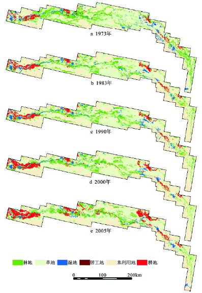 图2 1973年、1983年、1990年、2000年和2005年塔里木河干流区年土地利用/覆被空间分布