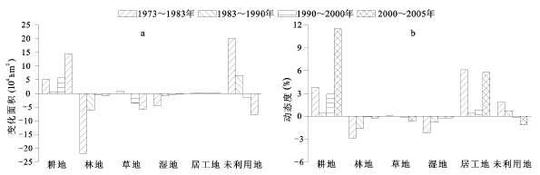 2000~2005年,耕地和居工地分别增加了59.57%和28.88%。与此同时林地、草地、湿地、未利用地面积表现出持续减小的趋势。在这一时段,耕地和居工地呈现剧烈的变化速度,其动态度分别为11.51%和5.78%。