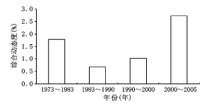 本研究以1973年MSS遥感影像,1983年1:10万航空遥感土地利用现状图[10],1990年、2000年两个时期的TM遥感影像,2005年CBERS遥感影像为主要数据源。各数据源处理流程如下:将1:10万地形图扫描输入计算机,进行投影处理,并以此作为主控数据源,分别将1973年、1990年、2000年、2005年遥感数据进行配准。利用ArcInfo Workstation中Arctools模块,根据不同土地覆盖类型的影像色调、纹理等特征,建立相应的遥感解译标志,进行目视解译,并进行查错和修改,得到不同年份的土地利用/覆被数据。1983年土地利用/覆被数据来源于1:2.5万航片,精度可靠[11]。精度检验采用随机抽样方法,分别在4期土地利用分类图上抽取360个样点,利用误差矩阵计算总精度和Kappa指数,结果表明:1973年、1990年、2000年、2005年的总精度和Kappa指数分别为:85.28%、89.17%、89.20%、88.67%和0.823、0.870、0.870、0.864,该精度能够满足大区域宏观土地利用/覆被变化分析的需要。