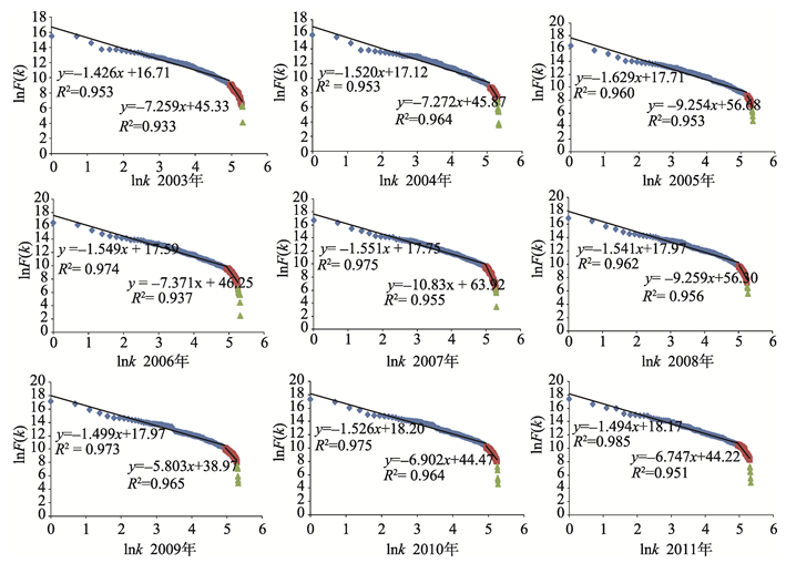 Fig. 6 The ln-ln graph of rank-size distribution of producer services' external service flow at city scale from 2003 to 2011 |
