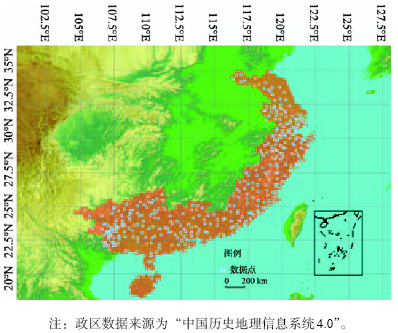 Fig. 1 The research area and the points with typhoon recorded in historical documents |