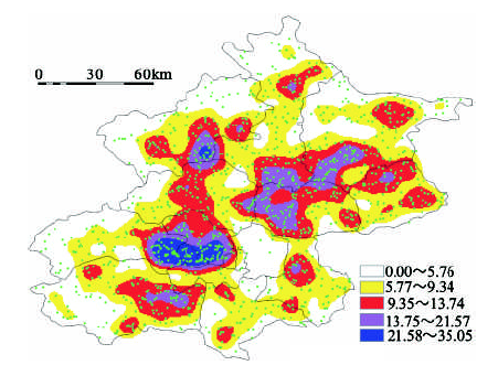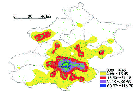 Fig.2 Kernel density distribution of natural scenery place-name in Beijing