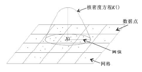 核密度方程的几何意义为:密度分布在每个xi 点中心处最高,向外不断降低,当距离中心达到一定阈值范围(窗口的边缘)处密度为0,见图1 [19 ] 。网格中心处的核密度为窗口范围内的密度和: