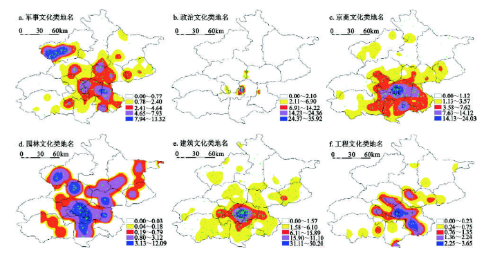 再次,北京各类文化景观类地名空间分布存在差异。中部地区人口密集,各种人类活动频繁,文化形式多样,文化内容丰富;政治文化、京商文化、园林文化、建筑文化与工程文化类地名核密度较其他区域高;形成了政治、商业、园林建设、建筑与工程项目活动集中分布的区域。东南部地区商业文化、水利工程设施文化类地名核密度较高,在京杭大运河的巨大影响下,成为经济、水利工程活动集中分布的区域。西北部地区是北京的“北大门”,而且有长城经过,其军事意义重大;东部地区则因发生过许多战争,军事活动较为频繁;因此,西北部与东部地区军事文化类地名核密度极高,形成了军事活动集中分布的区域。西北部与东北部地区由于人口密度较中部地区小,用地充足,而且山地与平地完美结合,符合北京园林建设的独特需求;因此园林文化类地名核密度较高,形成了园林建设活动集中分布的区域。