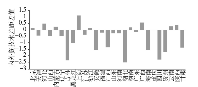 图6 内外资技术差距2007年与2003 年差值的省级分布(数据来源:中国工业企业数据库) |