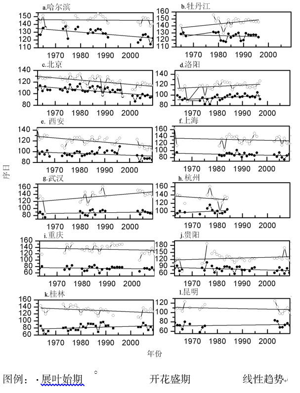 Fig. 4 Optimal viewing and admiring dates of first leaf and full flowering from 1963 to 2009 at each site |
