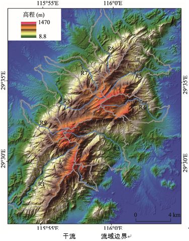 庐山山体为构造抬升而形成的中山地貌,数十座峰、岭的高度多在1300 m左右,其中南部的汉阳峰为最高峰,达1473 m。受边界断层的影响,山体边缘多悬崖峭壁,发育幼年期的地形—峡谷。而山体内部主要壮年期的地形—宽谷[21 ] 。通常认为庐山的壮年期地形及山顶夷平面是在第三纪形成,其后被新构造运动抬升至现今的高度[19 ] 。构造抬升导致侵蚀基准面下降,源自庐山的河流发生强烈的溯源侵蚀,形成峡谷,在溯源侵蚀未到达的地方,保留了壮年期的地形。