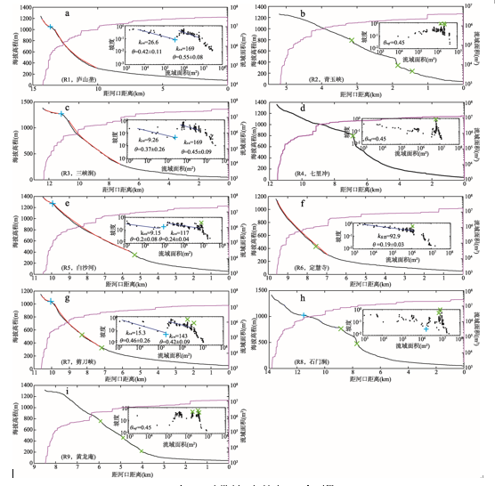 利用上述方法提取并分析了9条河流,并计算出每条河道的凹曲度和陡峭指数(表1 ,图3 )。这9条河流平均长度约10.5 km,平均流域面积约23.5 km2 。其中,青玉峡较短,流域面积也较小,约5 km2 ,其余河流的流域面积在10 km2 以上,最大达42 km2 。