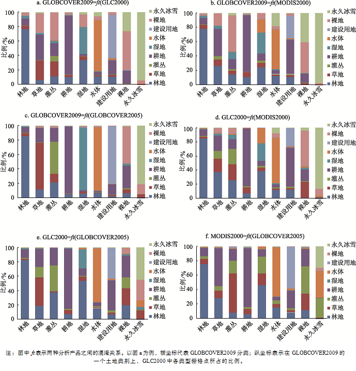 图3显示了不同卫星遥感土地覆被产品间的特定土地覆被类型中的像元混淆程度。在图中,当横坐标上的土地类型与纵坐标中的土地覆被类型相同时,即指示像元是纯净的;反之则指示像元是混淆的。