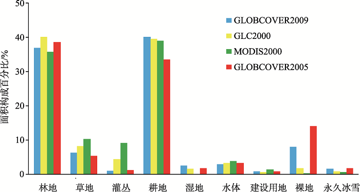 GLOBCOVER2009产品中耕地(面积占比40.18%)、林地(36.91%)是区域最主要土地类型,裸地(7.94%)、草地(6.32%)面积依次减少;GLC2000产品中林地(40.13%)、耕地(39.49%)优势明显,其次是草地(8.18%)、灌丛(4.34%)、水体(3.23%);MODIS2000产品中耕地(39.05%)、林地(35.85%)所占比重较高,草地(10.18%)、灌丛(9.09%)、水体(3.72%)依次递减;GLOBCOVER2005产品中林地(38.57%)、耕地(33.50%)占明显优势,其次为裸地(14.06%)、草地(5.24%)、水体(3.20%)。
