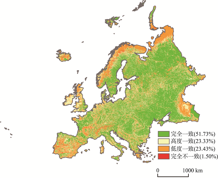 为分析土地覆被类型一致性程度在空间上的分异特点,针对欧洲地区土地覆被类型开展逐栅格点的对比分析(图4)。