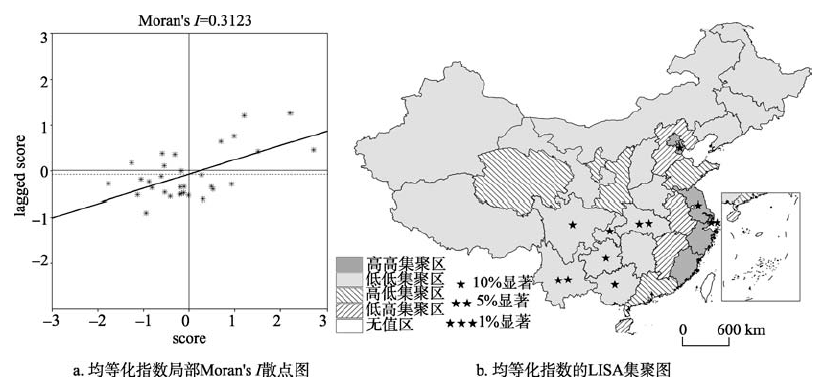 | Fig. 2 Moran scatters plot and LISA cluster diagram of equalization indexes of the basic public service in urban and rural areas |