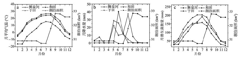 Fig. 4 Lake area change and variations of the monthly mean temperature, precipitation and potential annual evaporation at Shiquanhe, Hetian and Yutian stations in 2013