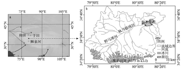 松木希错流域(79°46′~80°23′E,34°18′~34°44′N)位于喀喇昆仑山脉南部,南距喜马拉雅山脉阿伊拉日居地区180 km,地处喀喇昆仑—喜马拉雅过渡区(图1)。松木希错流域面积约1700 km2,海拔范围为5045~6652 m,平均海拔高度为5413 m。流域南部较高,地形崎岖;中间低,为汇流地区;松木希错位于流域东北部。流域为西风和印度季风两大环流的交互作用区,气候为高原亚寒带干旱气候和高原温带干旱气候过渡区[18],流域内冰川位于极大陆型冰川向亚大陆型冰川过渡带[19]。松木希错流域内没有气象台站,临近的气象台站有狮泉河站(4278 m)、和田站(1375 m)和于田站(1422 m),这3个站距研究区距离分别约为200 km、267 km和270 km。根据1968-2013年狮泉河站、和田站和于田站的年平均温度和降水数据,研究时段内平均温度分别为0.8 ℃、12.9 ℃和11.8 ℃;年降水量分别为71.6 mm、40.3 mm和51.4 mm,降水主要集中在5-9月,分别占88.6%、71.5%、80.7%。根据王苏民等的研究[20],松木希错流域气候干寒,年均气温约为-8 ℃左右,年均降水量75~100 mm,湖水主要靠地表径流补给。