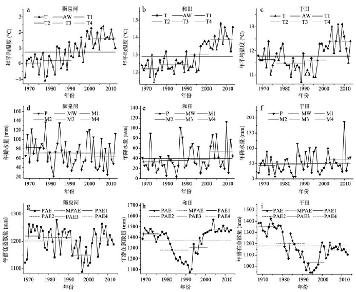 5.1.1 气候变化对湖泊变化的影响 研究中采用狮泉河站、和田站和于田站3个气象台站的年平均气温(T)、年降水量(P)和年潜在蒸散量(PAE)数据进行分析,AW、MW和MPAE分别指T、P和PAE多年(1968-2013年)平均值,T1、T2、T3和T4分别指1968-1976年、1976-1991年、1991-2001年和2001-2013年四4个阶段气温的平均值,年降水量和年蒸散量4个阶段的平均值标号与此类似(图2)。