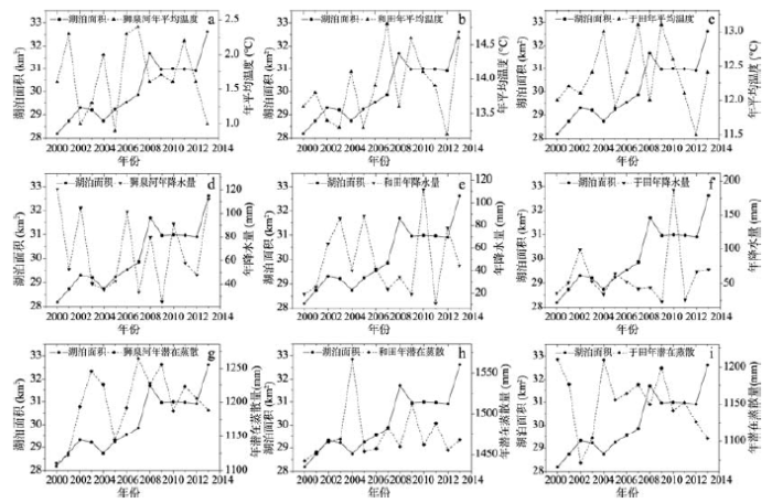 图3 2000-2013年湖泊变化与狮泉河、和田和于田的年平均温度、年降水量、年潜在蒸散量变化
