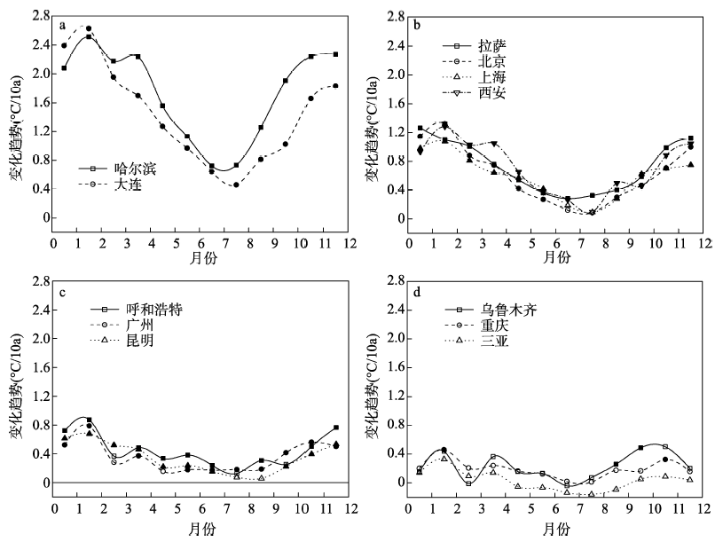 | 图4 1960-2013年重点旅游城市月均UTCI的变化趋势(oC/10a)(注:实心标志代表达到0.05显著性水平) |